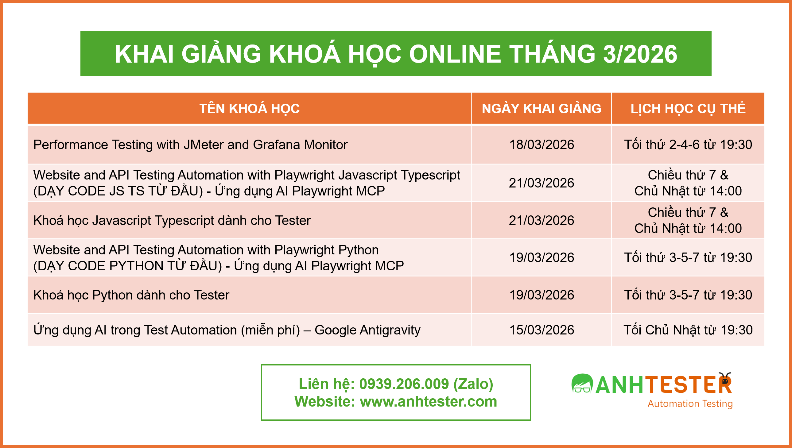 Anh Tester vừa cập nhật các khoá học Online qua ZOOM mới như Performance Test với JMeter Grafana, Playwright JS/TS, Playwright Python, Ứng dụng AI trong Test Automation tháng 03/2026.