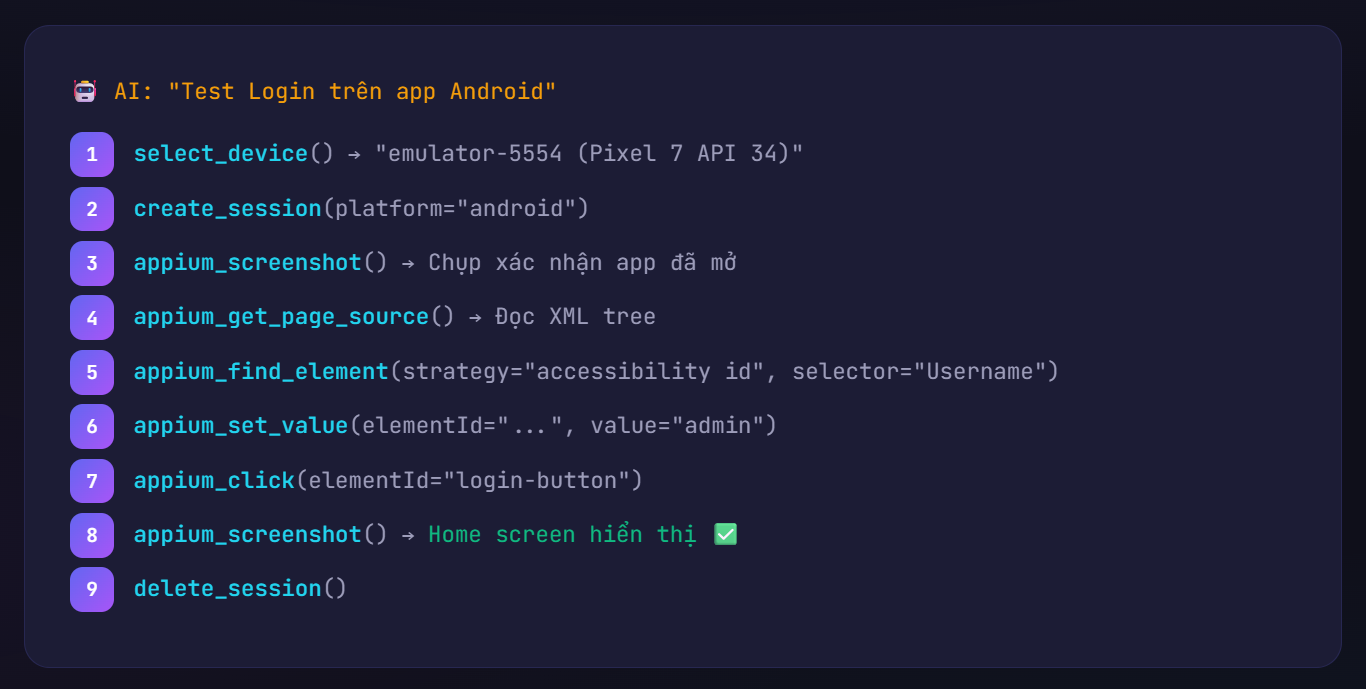 | AI Vision (tìm element bằng ngôn ngữ tự nhiên) | ❌ | ✅ (Appium MCP) |