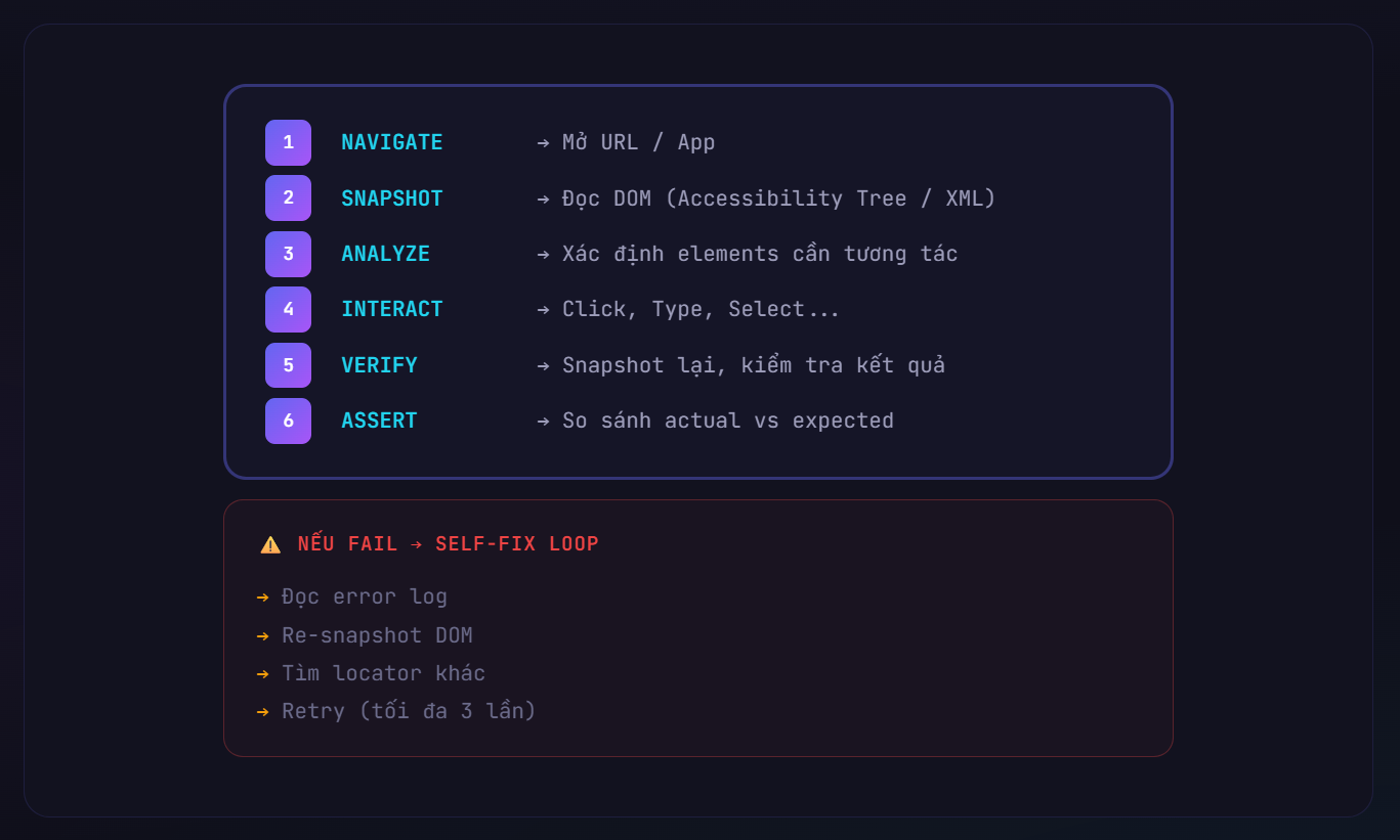 | AI viết script rồi... cầu nguyện 🙏 | AI viết → chạy → fail → tự sửa → PASS ✅ |
