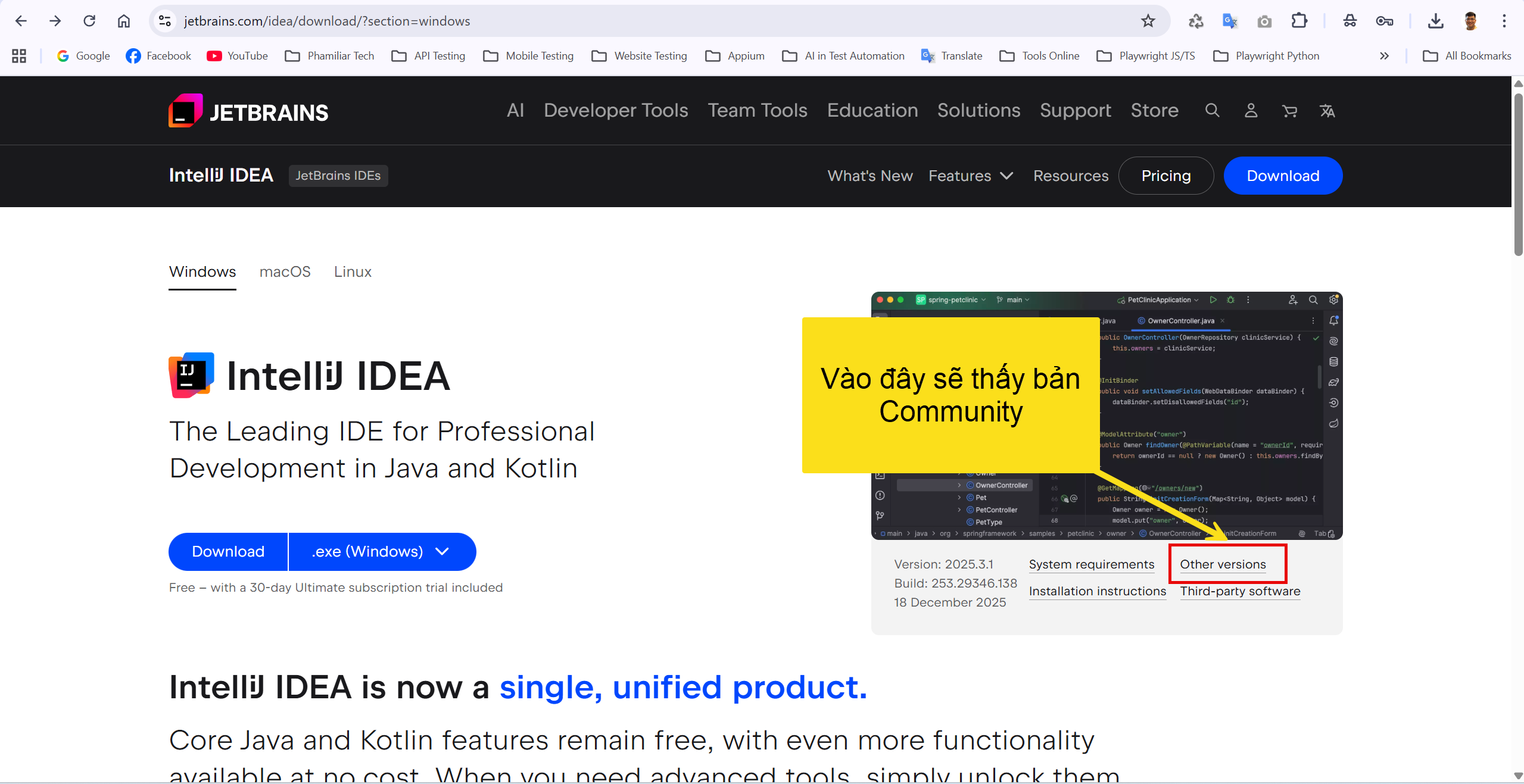Bước 1: Truy cập https://www.jetbrains.com/idea/download để download file cài đặt IntelliJ IDEA Community. Chọn bản Community nhé. Không tải bản Ultimate.