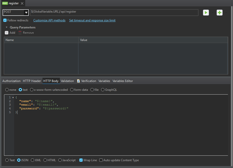 - Variables: Định nghĩa các biến để sử dụng trong request.
