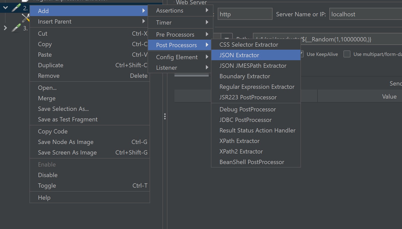Vị trí thêm: (Sampler) → Add → Post Processors → JSON Extractor