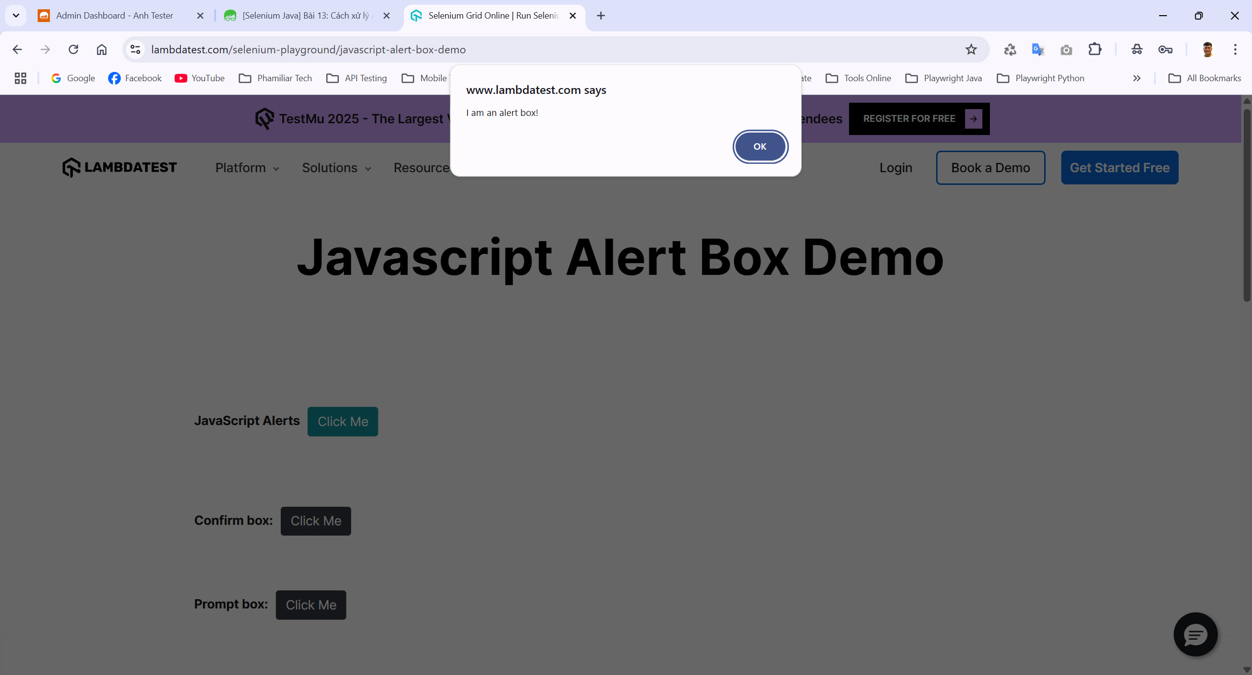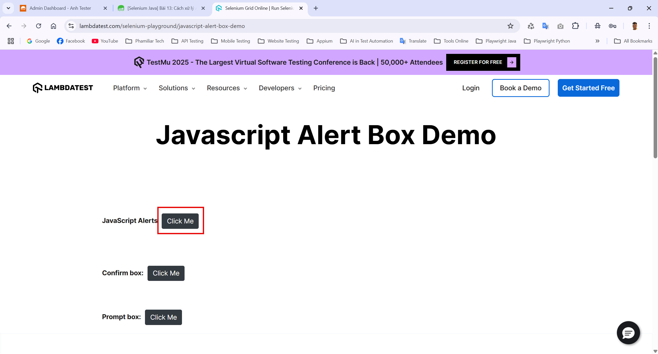 Bước 1: Vào website https://www.lambdatest.com/selenium-playground/javascript-alert-box-demo
